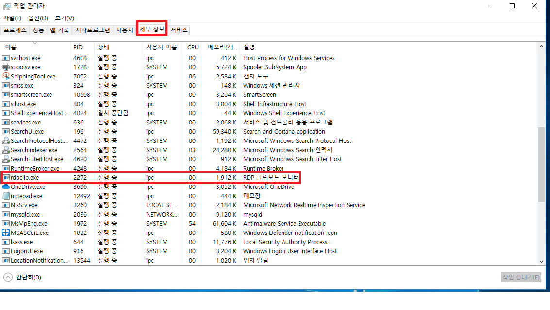2. 세부정보 탭에 들어가 rdpclip.exe 파일을 찾는다.