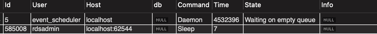 * Command : 실행중인 스레드 명령 타입 (명령 값 https://dev.mysql.com/doc/refman/8.0/en/thread-commands.html)